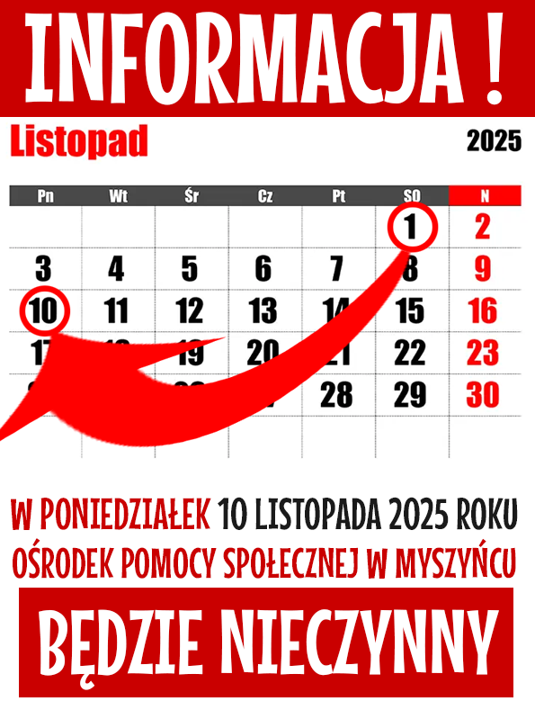 Uprzejmie informuję, iż zgodnie z Zarządzeniem Nr 5/2025 Kierownika Ośrodka Pomocy Społecznej w Myszyńcu z dnia 22 września 2025 r. dzień 10 listopada 2025 r. (poniedziałek) jest dniem wolnym od pracy dla pracowników Ośrodka Pomocy Społecznej w Myszyńcu w zamian za sobotę 01 listopada 2025 r. (dzień świąteczny przypadający w innym dniu niż niedziela tj. sobotę)